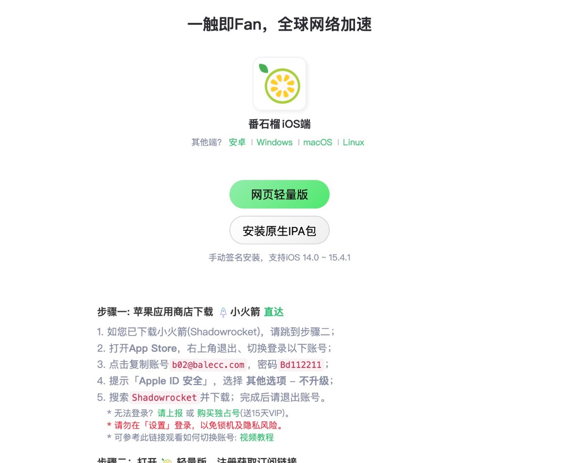 最开始的时候是在很多论坛中看到大家推荐,从他们的网站:fanshiliu.site 可以直接下载对应客户端,比较友好的是他们还专门为iOS用户提供了免费下载小火箭的共享账号,这里值得点赞。PS:我用过很多机场,有很多大机场的服务基本等于没有~~~