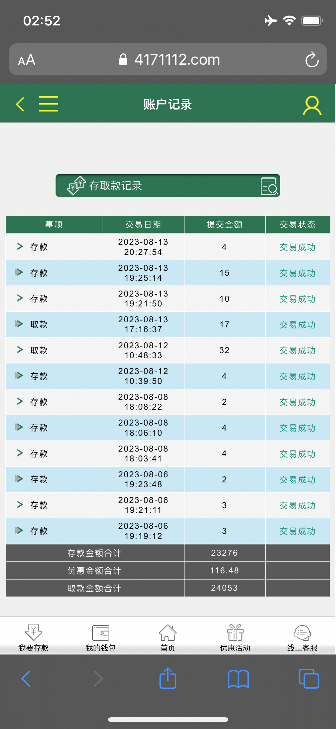 30本金玩电子上到四百提银行卡给我拒绝提现 想着不给提就算了 然后去梭哈Ag 玩到一千块 提到钱能钱包 到账了 之后就一直充提 玩Ag一直陆陆续续赢 然后提钱能钱包 又冲又提 最高上到2.1w 而且2.1w都全部到账钱能钱包了 反水撸了一千多 加上钱能钱包存取款那个活动 存取款彩金撸了一千多 总是感觉还能赢。上头两个小时全部挂完 一下清醒了  人心不足蛇吞象 狗庄不怕你赢 钱 就怕你不玩 输完了 睡得着了
