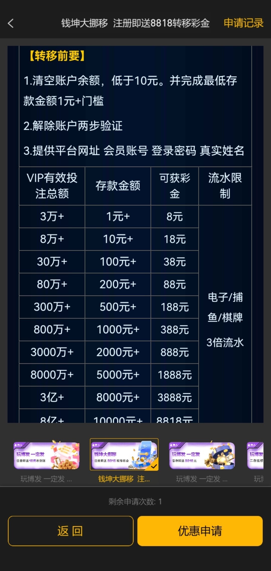 V6等级的话再加上打码多的话可以来申请博发集团的转移彩金 充个几块钱打码就申请他只是登个平台看个等级看你最近充值的活跃度他就给你派发彩金了