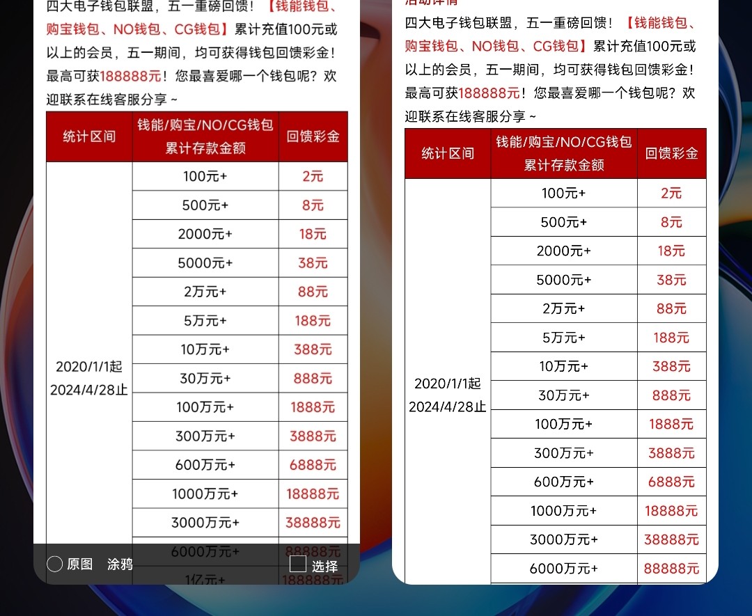 五一钱能红包台子出了历史充值一万给500,三千充值给100比之前的抠了。还有2020年到2024年总充值100w给1888