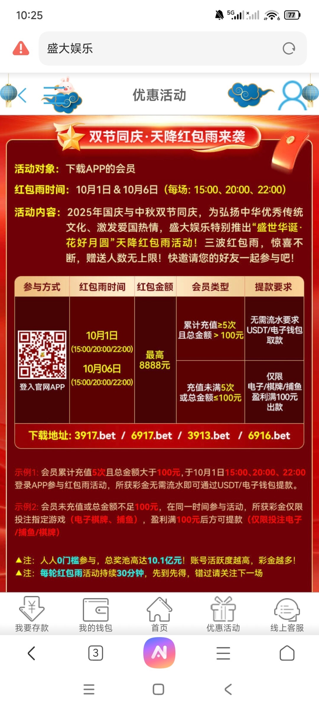 盛大娱乐 网站SDYL.CC 国庆红包活动,15 20 22点可抢三次,未充值也可以