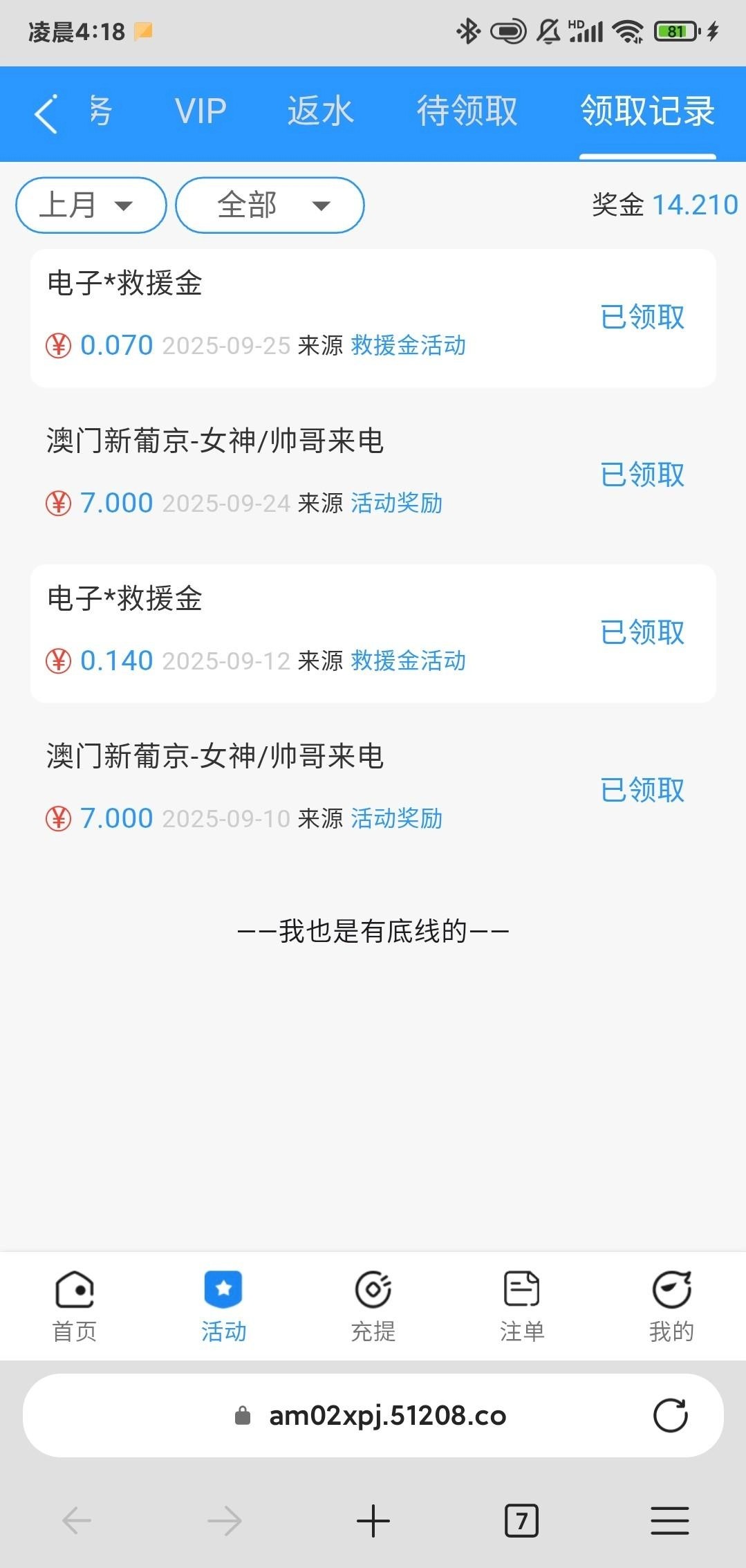 短信特邀彩金以前领过,提过,充值过!得吃的老板赏口饭吃。谢谢老板,祝各位老板一路长虹链接4627.com