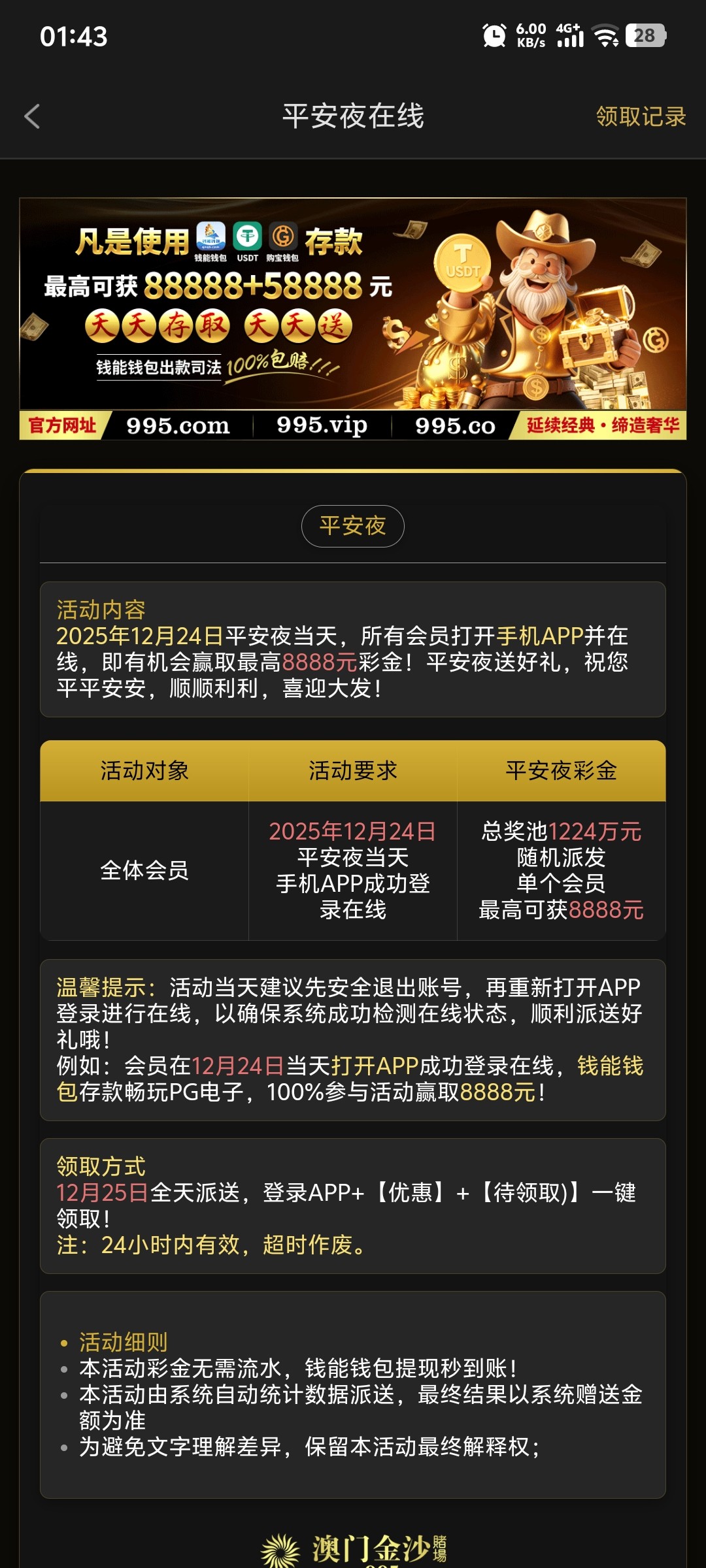 24号登录即可,25号有彩金
