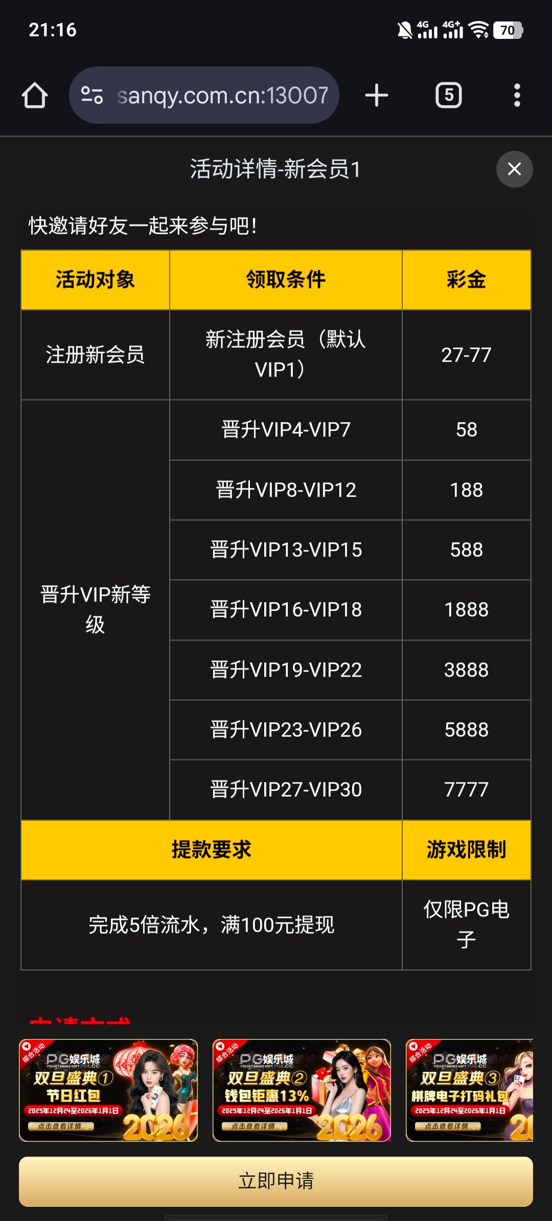 注册账号 绑定信息 自助申请27彩金 彩金打码5倍流水满100即可提现