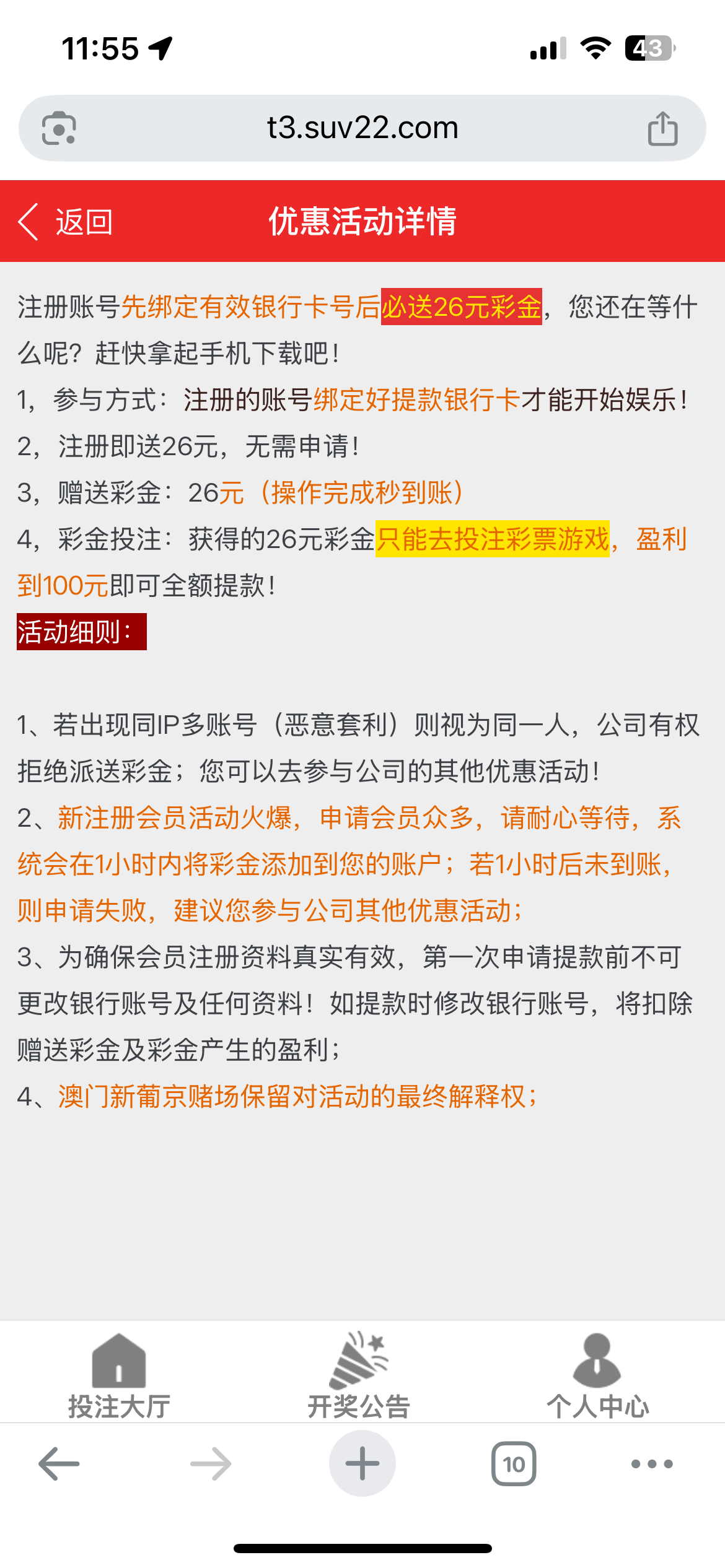 注册绑定银行卡秒送26彩金只能彩票一百提款